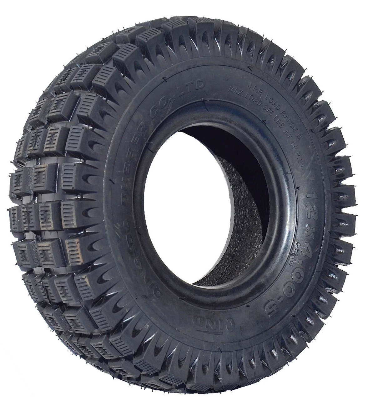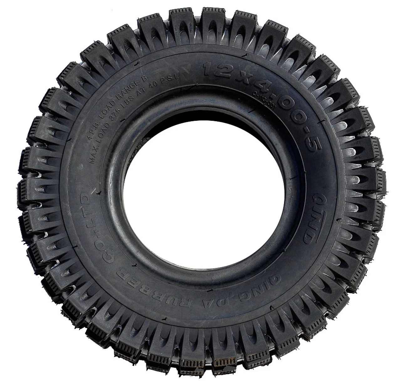Heavy duty 5″ tire (12×400-5) . Same size as the standard 410 x 350-5 stud tire. This is an impressive tire that will last more than twice the life of a standard 5″ studded tire.