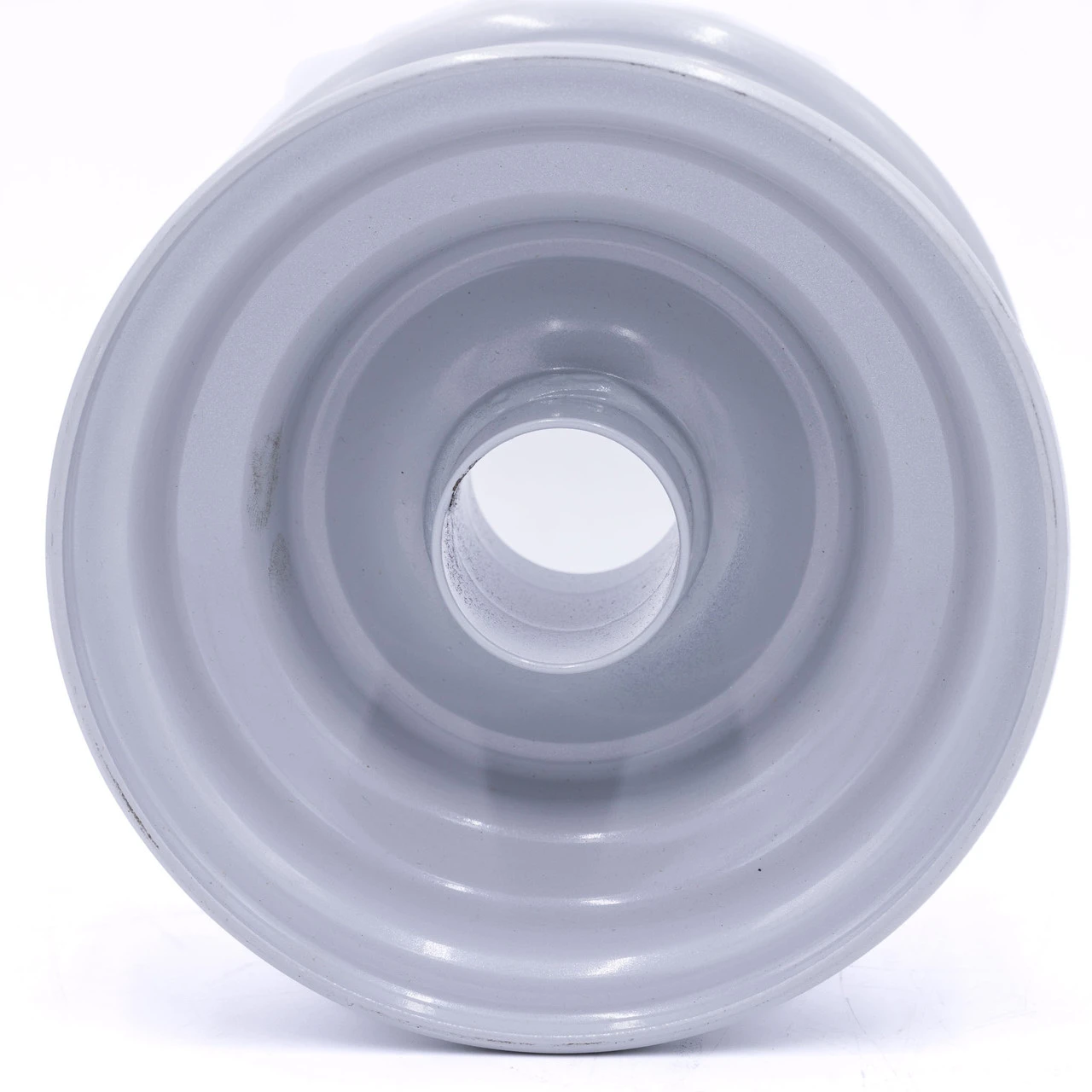 One piece wheel bearing type for 5″ tire. Wheel is 3.5″ wide bead to bead, hub is 2 3/4″ deep. Gray in color.