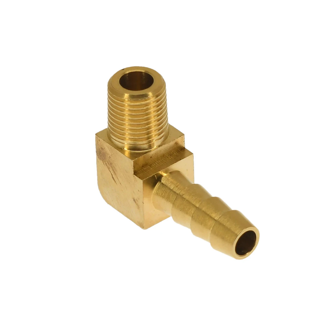 1/4″ BARB with 1/8-27 NPT threads, typically used on valve covers or anywhere that you need a 90 degree fitting instead of a straight one. May be brass or silver in color